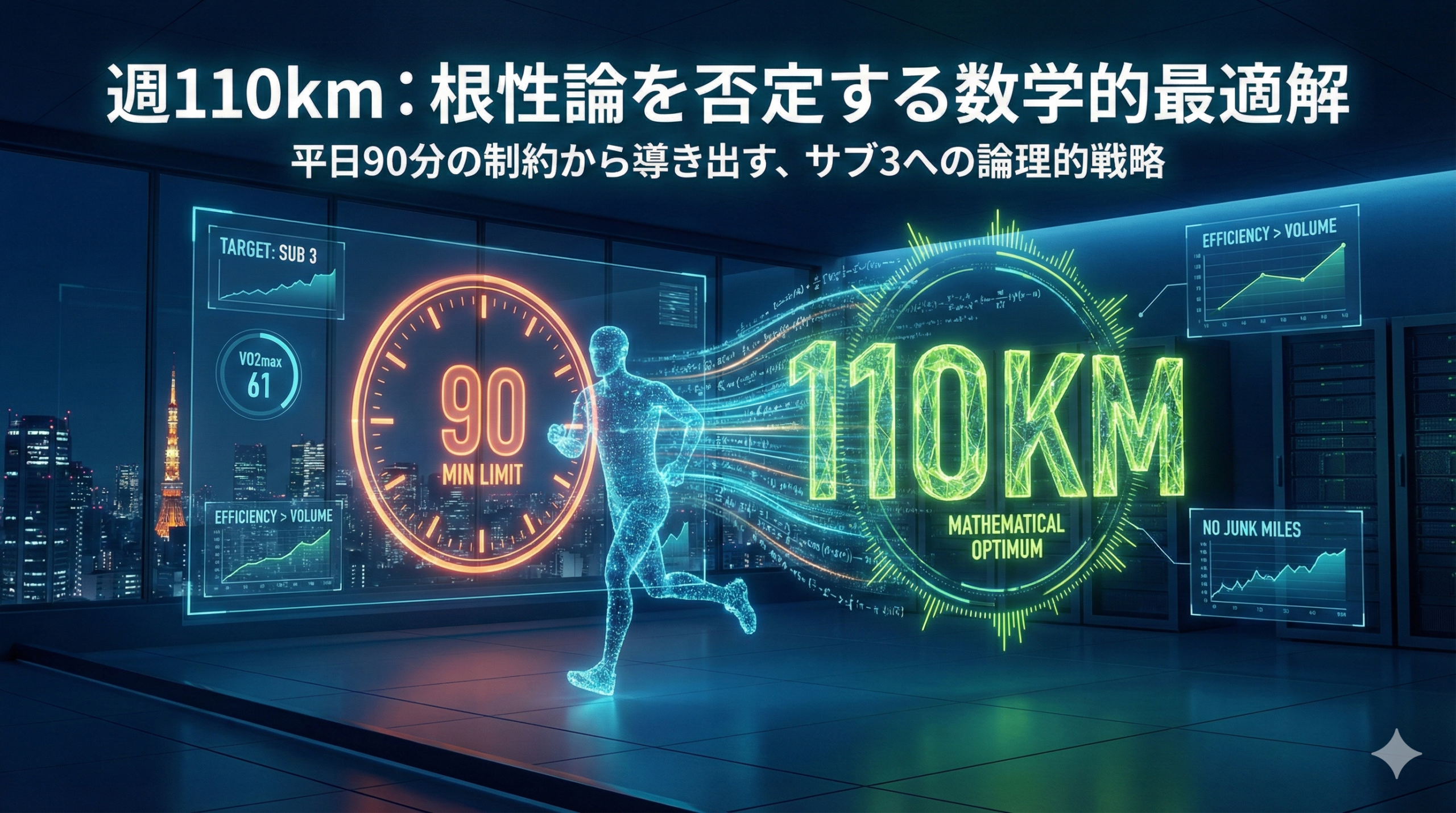 週110kmは根性論ではなく、平日90分という時間制約から逆算して導き出した数学的最適解である。平日の可処分時間(90分)とEペース(5:00/km)から最大18kmを算出し、ポイント練習を12〜15kmに設定。週間積算で120kmとなり、疲労バッファ5〜10%を差し引いて110kmに落ち着いた。この数字に縛られる必要はないが、「質を1%も落とさずに確保できる最大ボリューム」という基準は、時間制約のあるランナーにとって重要な指針となる
