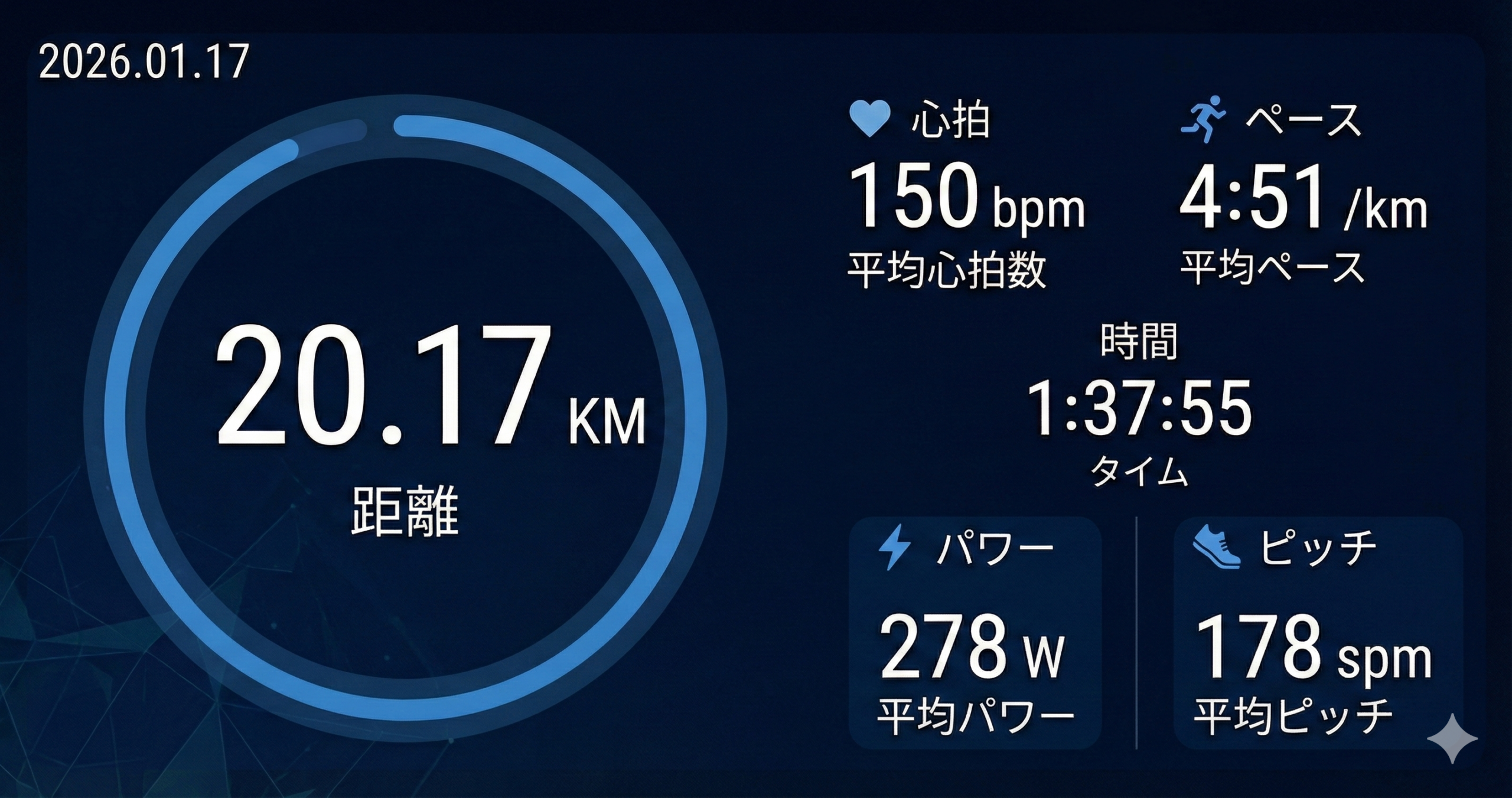そこで立てた仮説は、**「強度は捨てて、距離(ボリューム)を伸ばす」こと。 メニューを「MP 16km」から「Eペース 20km」**へ変更し、心肺へのダメージを抑えつつ、脚作りとしての走行時間を確保する実験を行った。