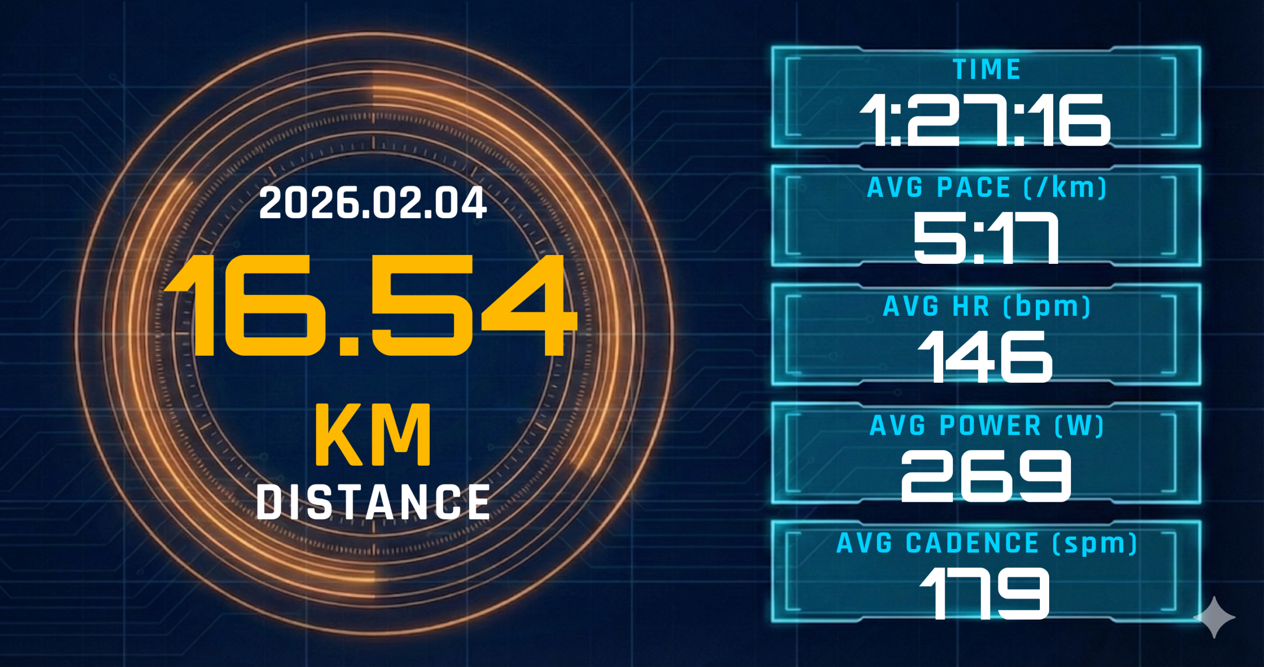 16.54 km5:17 /km146 bpm179 spm9.6 cm